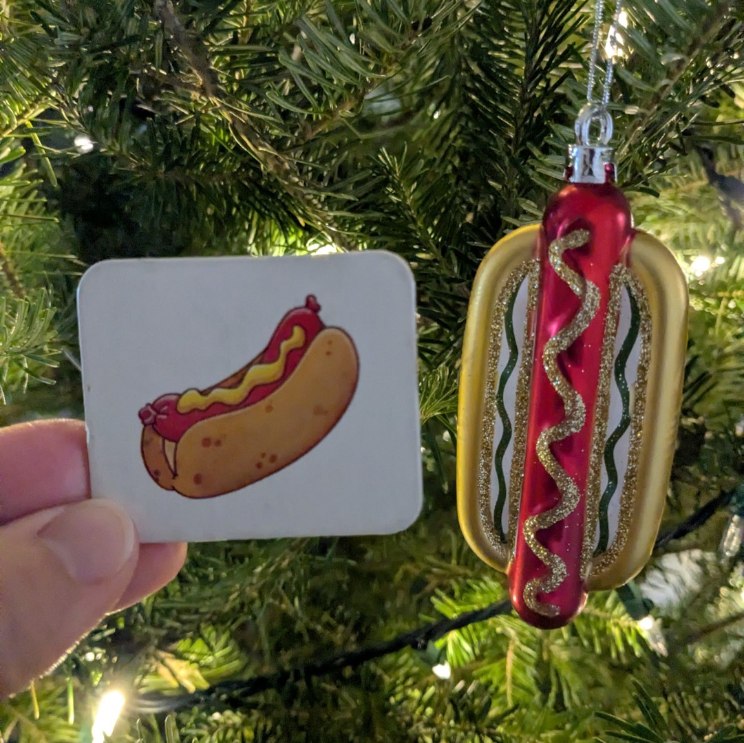 I received some VERY nice gifts from family and friends this year. One of my favorite gifts is from DD1. She gave me an ornament that reminded her of the the Wiener Schnitzel card from the game Memory from the 1990’s. I LOVE it! It is hanging on the tree right now and I will make sure I get it out next Christmas and every year after.